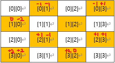 2차원 배열 문제를 풀 때는 이렇게 배열 인덱스를 직접 적어서 그려놓고 보면, 보다 더 직관적으로 문제를 풀 수 있던 적이 꽤 있었다. (진짜 문제를 풀땐 공책에 휘갈겨 적어서 풀었다.) 문제의 예시 입력을 그려 봤더니, 당근이 심겨지는 곳의 인덱스의 특징이 보였다. ↓↓↓↓